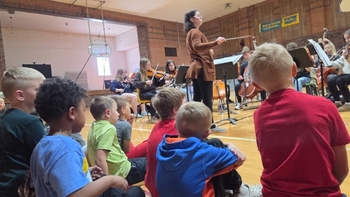 The Beloit High school string orchestra performed for the Rock Hills Elementary students on Tuesday, March 24. The orchestra made up of double bass, cello, viola and violins performed "The National Anthem" and "How to Train your Dragon". Then orchestra members demonstrated each instrument as their instructor, Ms. Julia McMains, introduced and described each instrument. The students also had time for a question and answer period with the orchestra members. This performance was made possible by Title funds for Fine Arts and Stem classrooms.